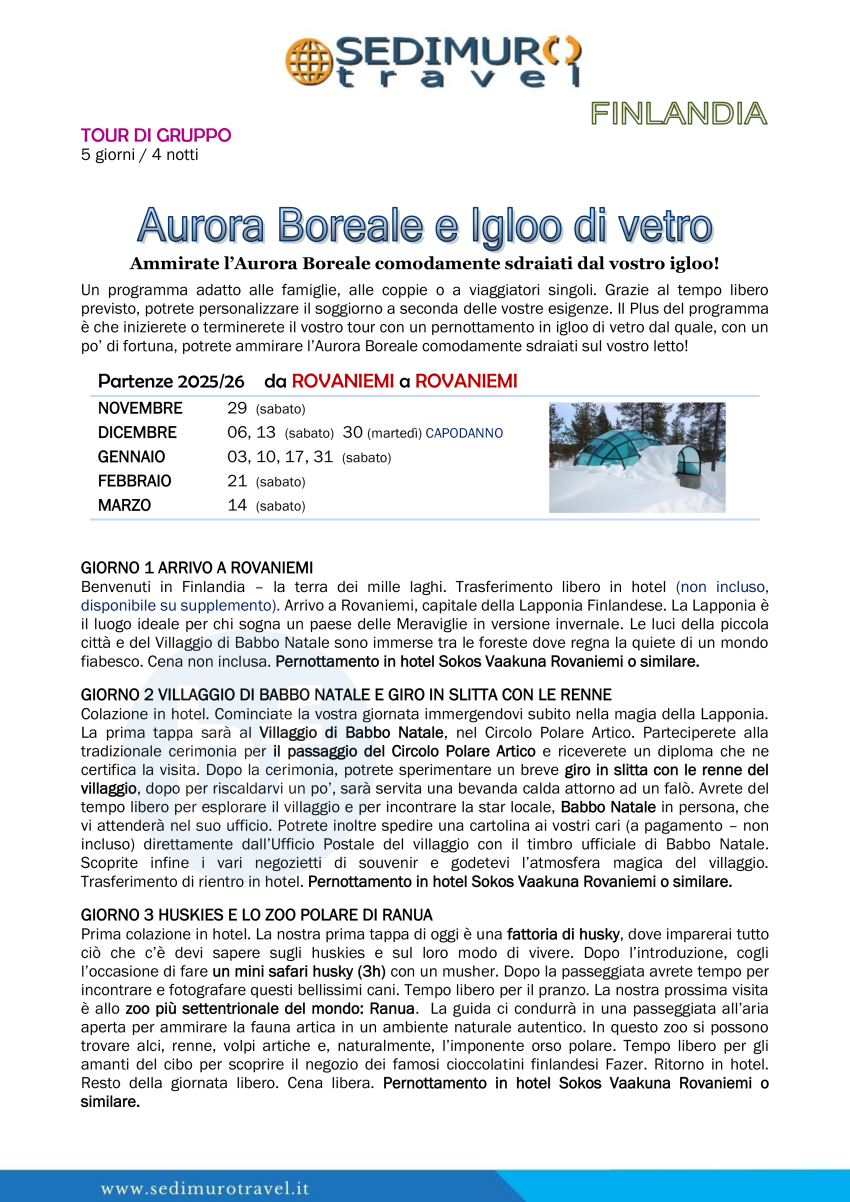 Aurora Boreale e Igloo di vetro da Rovaniemi 5 giorni