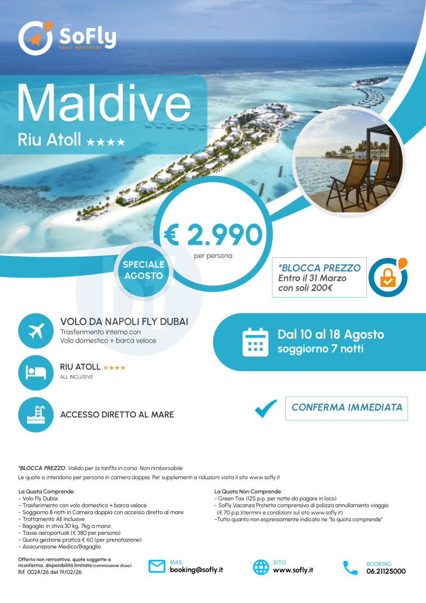 Speciale Maldive Agosto con volo da Napoli a partire da € 2990 a persona