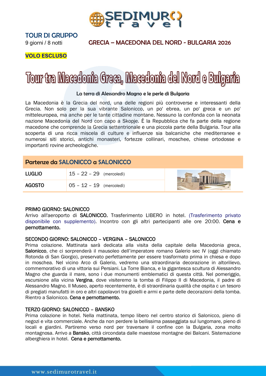 Tour tra Macedonia Greca, Macedonia del Nord e Bulgaria da Salonicco 9 giorni