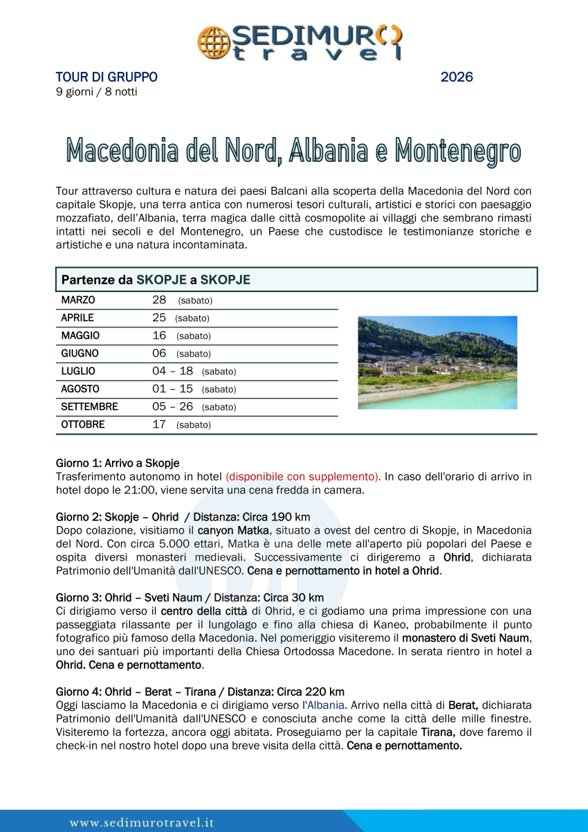 Macedonia del Nord, Albania e Montenegro da Skopje 9 giorni